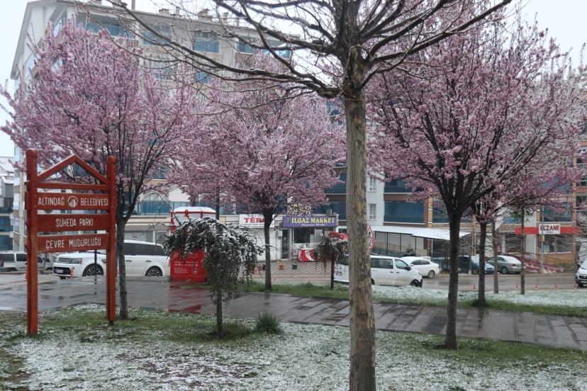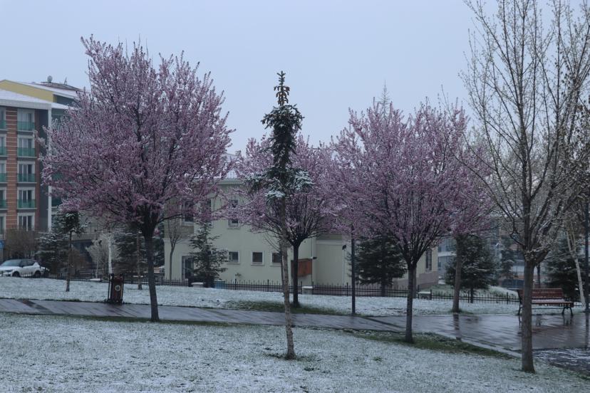 Baharın gelişiyle birlikte çiçek açan bazı ağaçlar ise yağan karla kaplandı. Ortaya çıkan görüntüler, mevsimlerin iç içe geçtiği nadir anlardan biri olarak dikkat çekti.