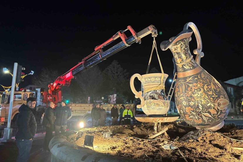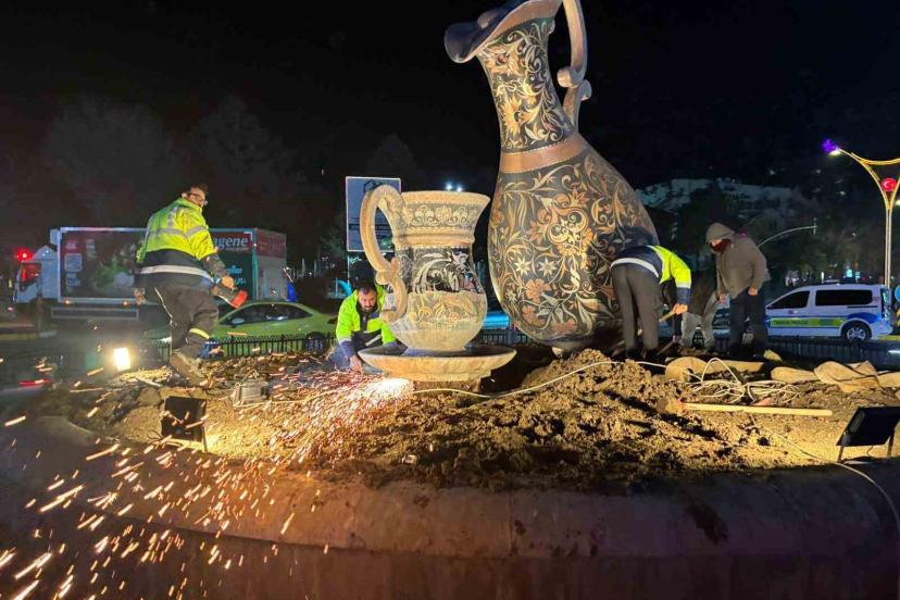 Erzincan’da şehir merkezinin simgelerinden biri olan bakır sürahi, bakım ve onarım çalışmaları kapsamında geçici olarak yerinden kaldırıldı.