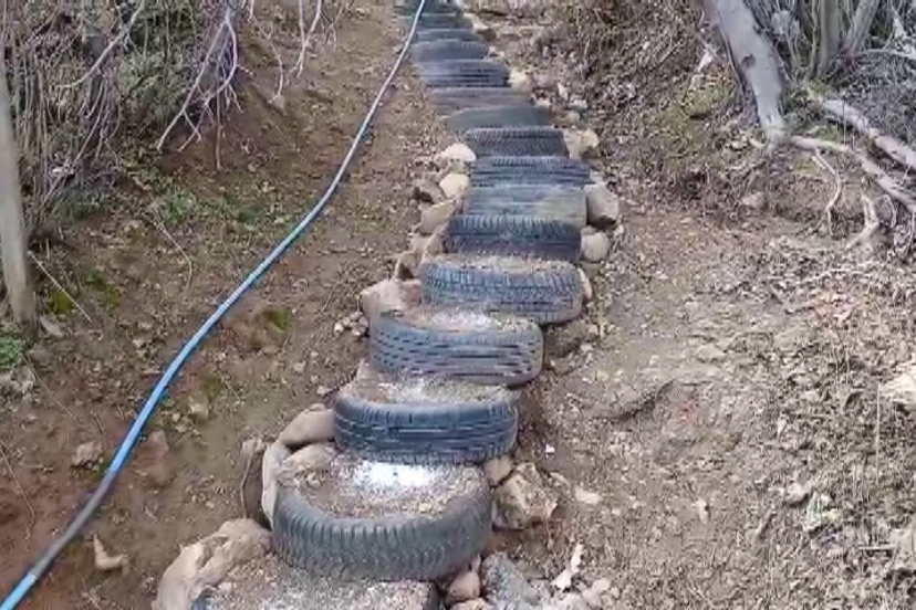 Lastiklerin içini toprakla doldurarak sabitleyen mahalleli, böylece hem kaymayı önledi hem de daha güvenli bir geçiş yolu oluşturdu.
