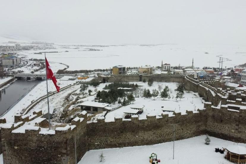 Beyaza bürünen Ardahan Kalesi havadan görüntülendi