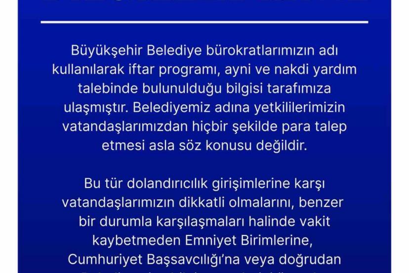 Erzurum Büyükşehir Belediyesi, Ramazan Ayı münasebetiyle vatandaşları uyardı. Uyarıda; bürokratların adı kullanılarak iftar programı, ayni ve nakdi yardım talebinde bulunulduğu ifade edildi ve vatandaşların bunlara itibar etmeyerek güvenlik güçlerine bilgi verilmesi istendi.