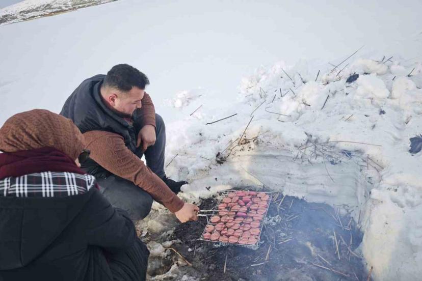 Arkadaşlarıyla birlikte donan Nazik Gölü üzerinde sucuk ekmek keyfi yapan Ercan Baş, "Nazik Gölü donunca ayrı bir güzelliğe bürünüyor. Bizler de hafta sonları arkadaşlarımızla donan Nazik Gölü çevresinde gezmeye, kar üzerinde sucuk ekmek yapıp yemeye geliyoruz. Kar buralara ayrı bir güzellik katıyor. Biz de bu güzel anların keyfini çıkarıyoruz" dedi.