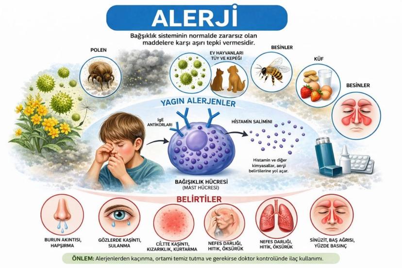 En yaygın görülen alerjik hastalıklar; alerjik rinit (saman nezlesi), alerjik astım, ürtiker, atopik dermatit (egzema), arı alerjileri ve bazı gıda alerjileridir.