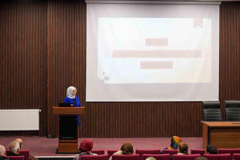 Sağlık Bilimleri Fakültesi Konferans Salonu’nda gerçekleştirilen etkinliğe akademisyenler, öğrenciler ve çok sayıda davetli yoğun ilgi gösterdi. Müftü Yardımcısı Özlem Gülbe, gerçekleştirdiği sunumda kadının toplumsal hayattaki aktif rolüne, bireysel ve sosyal sorumluluklarına vurgu yaptı. İslam dininin kadına verdiği değeri ve tarihi süreçteki öncü kadın figürlerini hatırlatan Gülbe, modern dünyada kadının yönetici kimliğiyle sunduğu katkıları dini ve sosyolojik bir perspektifle ele aldı.