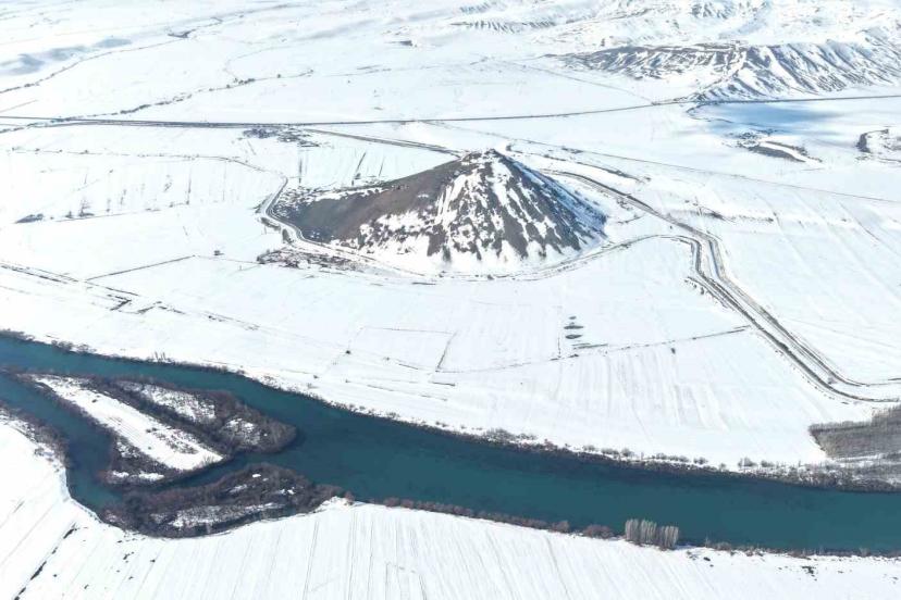 ’Muş Piramidi’ olarak bilinen Mercimek Kale Höyüğü, etkili olan kar yağışının ardından beyaz örtüyle kaplanarak eşsiz görüntüler sundu.