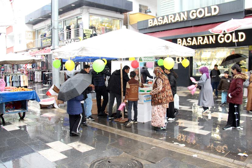 Diyarbakır'ın dört bir yanında programa davet ve bilgilendirme broşürleriyle çalışmalarını yürüten Peygamber Sevdalıları, sabah saatlerinde kenti etkisi altına alan sağanak yağış altında Bağlar İlçesinde esnafı ziyaret etti.