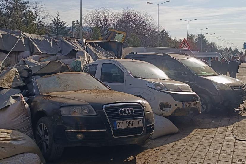 Saman yüklü tır park halindeki araçların üzerine devrildi