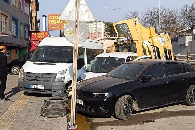 Diyarbakır'ın Silvan ilçesinde seyir halindeki saman yüklü tır, park halindeki araçlara çarparak devrildi.