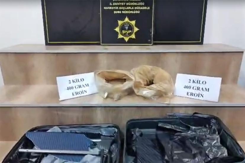 Şüphelinin üzerinde ve eşyalarında yapılan aramada, bir valiz içerisinde 2 parça halinde toplam 2 kilo 400 gram eroin ele geçirildi.
