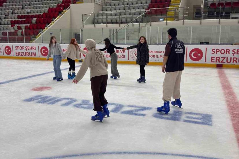 Daha sonra gençler Erzurum Buz Pateni Salonu’nu ziyaret ederek buz pateni deneyimi yaşadı. İlk kez buz pateni yapan öğrenciler için heyecan dolu anlar yaşanırken, ortaya renkli görüntüler çıktı.