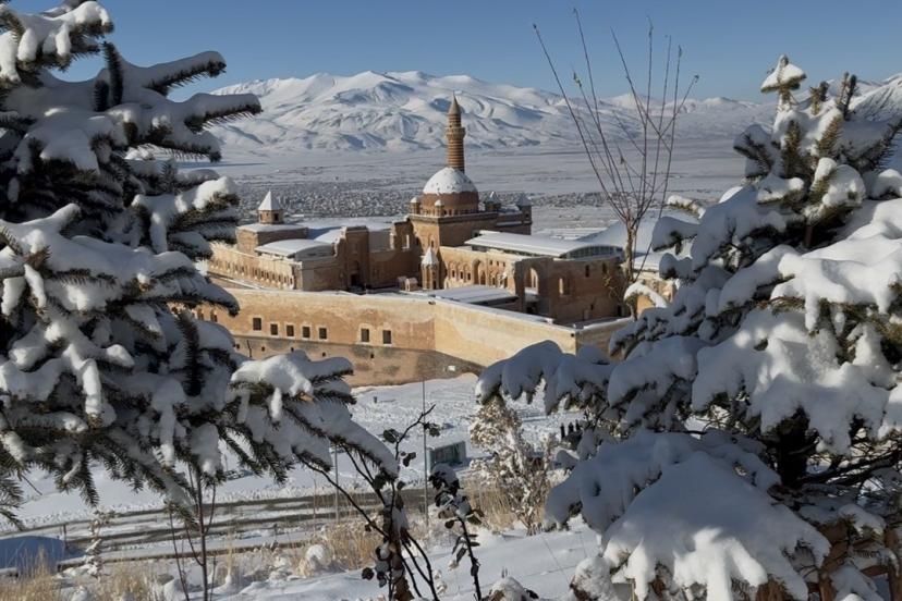Kar yağışının ardından sarayın avlusu, taş duvarları ve çevresindeki tarihi dokular tamamen karla kaplanırken, oluşan manzara görenleri hayran bıraktı. Doğubayazıt’ın simgelerinden biri olan İshak Paşa Sarayı, karın etkisiyle kartpostallık görüntüler sunarak ziyaretçilerin ve fotoğraf tutkunlarının ilgisini çekti.