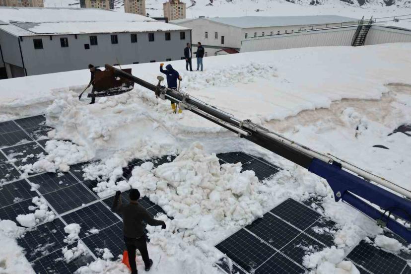 BİTLİS (İHA) – Bitlis Organize Sanayi Bölgesi’nde yoğun kar yağışı nedeniyle fabrika çatıları ve güneş enerjisi panellerinde oluşan hasara karşı işletmeler, vinç destekli yeni bir temizlik yöntemi geliştirdi.
