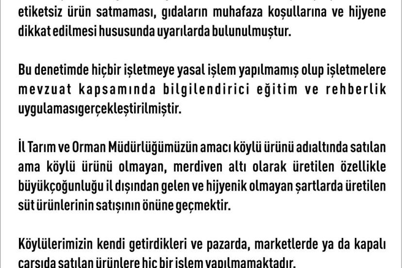 Elazığ Valiliği’nden yapılan açıklamada, "İlimizde yürütülen gıda denetimleri; vatandaşlarımızın güvenilir ve sağlıklı gıdaya ulaşmasını sağlamak amacıyla ilgili kurumlarımız tarafından mevzuat çerçevesinde düzenli olarak sürdürülmektedir. Bu kapsamda gerçekleştirilen denetimlerin amacı herhangi bir kesimi mağdur etmek değil; halk sağlığını korumak, güvenilir gıda arzını temin etmek ve kayıt dışı üretimin önüne geçmektir. İl Tarım ve Orman Müdürlüğümüzce 5996 sayılı Veteriner Hizmetleri, Bitki Sağılığı, Gıda ve Yem Kanunu kapsamında, yıl boyunca titizlikle yürütülen gıda denetim faaliyetlerimiz Ramazan ayı boyunca arttırılmıştır. Cumhurbaşkanlığı İletişim Merkezi(CİMER)’ ne yapılan şikayete istinaden halkımızın alışveriş için yoğun talep gösterdiği kapalı çarşıda 11.03.2026 tarihinde İl Tarım ve Orman Müdürlüğü tarafından denetim gerçekleştirilmiştir. Vatandaşlarımızın güvenilir gıda tüketmesi adına kapalı çarşı esnafına etiketsiz ürün satmaması, gıdaların muhafaza koşullarına ve hijyene dikkat edilmesi hususunda uyarılarda bulunulmuştur. Bu denetimde hiçbir işletmeye yasal işlem yapılmamış olup işletmelere mevzuat kapsamında bilgilendirici eğitim ve rehberlik uygulaması gerçekleştirilmiştir. İl Tarım ve Orman Müdürlüğümüzün amacı köylü ürünü adı altında satılan ama köylü ürünü olmayan, merdiven altı olarak üretilen özellikle büyük çoğunluğu il dışından gelen ve hijyenik olmayan şartlarda üretilen süt ürünlerinin satışının önüne geçmektir. Köylülerimizin kendi getirdikleri ve pazarda, marketlerde ya da kapalı çarşıda satılan ürünlere hiç bir işlem yapılmamaktadır" denildi.