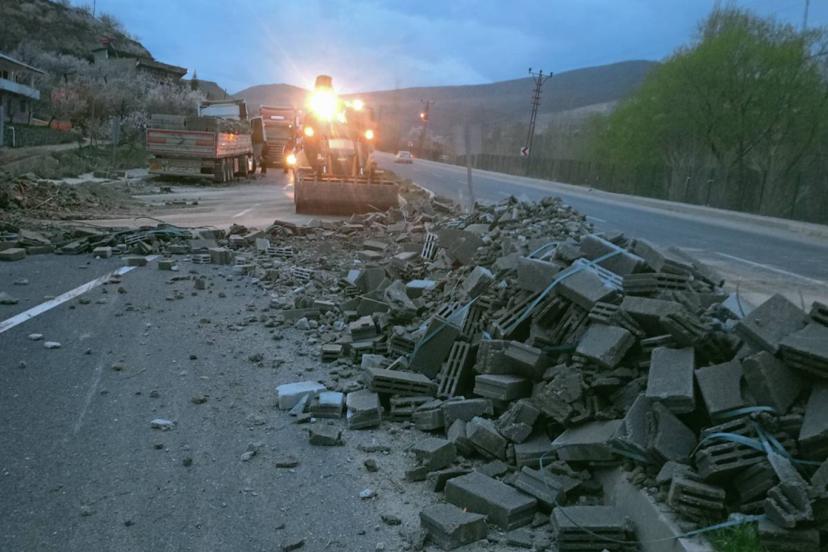Darende'den Malatya'ya bims taşıyan tır'ın kontrolden çıkarak karşı şeride geçmesi sonucu yola saçılan yük nedeniyle trafik bir süre durdu.