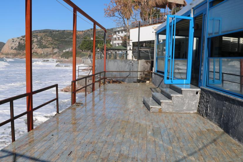 Dinek Mahallesi'nde dün kuvvetli rüzgar nedeniyle oluşan dev dalga, deniz kenarındaki restorana kadar ulaştı. Restoran çevresindeki cam korkuluğu aşan dalga, masa ve sandalyeleri sürükledi. Temizlik yapan restoran çalışanı da dalganın etkisiyle yere düştü. Sürüklenen restoran çalışanının dalgadan kaçmaya çalıştığı anlar, kameraya yansıdı. Bu sırada yemek yiyen 2 müşteri de korkuyla masadan kalktı. Dalga nedeniyle su basan restoranda çalışanlar ve müşterinin yaşadığı panik, güvenlik kamerasına yansıdı.