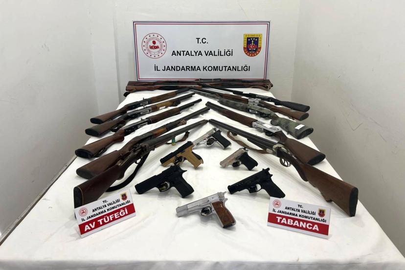 Antalya İl Jandarma Komutanlığı ekipleri, Antalya Cumhuriyet Başsavcılığı talimatları doğrultusunda Kepez ilçesinde ruhsatsız silah bulundurdukları tespit edilen 8 şüpheliye ait ikametlerde arama yaptı. Aramalarda; 6 ruhsatsız tabanca ve şarjörü, 15 ruhsatsız av tüfeği ile 50 av tüfeği fişeği ele geçirildi. Şüpheliler hakkında adli ve idari işlemlerin başlatıldığı bildirildi.