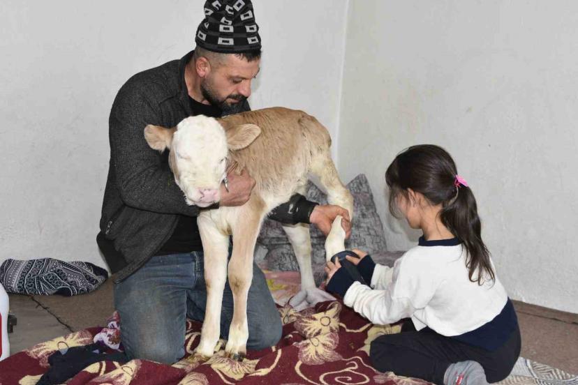 Çetin Aygül, yeni doğan buzağının hasta ve hava şartlarının da oldukça soğuk olması nedeniyle onu eve aldıklarını belirterek, "Buzağımız henüz çok küçük. Üşümemesi için sobanın yanında ona özel bir yer hazırladık. Adeta bir bebek gibi bakımını yapıyoruz" dedi.